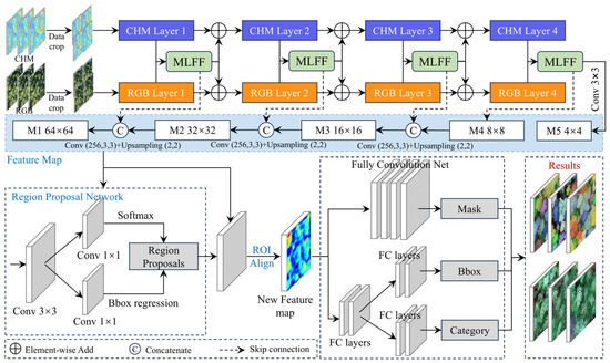 The architecture of MSFFNet is illustrated in Figure 3. It comprises three primary stages: feature extraction, region of interest (ROI) generation, and instance mask prediction. In the feature extraction stage, MSFFNet emphasizes deep interaction among multi-source data to enhance hierarchical feature integration. Specifically, MSFFNet adopts a dual-branch parallel design that interactively fuses complementary information from multimodal inputs, with each branch dedicated to capturing modality-specific features. To address the computational challenges posed by high-resolution UAV imagery, both branches employ SegFormer as the backbone network. This design leverages sequence reduction mechanisms and implicit positional encoding to model long-range contextual dependencies while significantly reducing parameter overhead. It not only overcomes the inherent computational bottlenecks of Transformer-based architectures in handling high-resolution inputs but also mitigates the sensitivity of conventional methods to image resolution variability. Its efficient feature extraction aligns well with the multiscale structural characteristics of forest canopies, offering an ideal solution for individual tree segmentation in complex terrains. Considering the substantial geometric and semantic differences between RGB images and CHM data, a multi-level feature fusion (MLFF) module is introduced between the two branches. This module facilitates deep cross-modal feature fusion and improves the model’s capability in crown detection and boundary delineation by integrating hierarchical representations across modalities. In the second stage, the fused multi-level feature maps are input into a region proposal network (RPN) to generate initial ROIs. In the final stage, deformable ROI alignment is applied to adaptively match each candidate region with the shared feature maps, enabling precise extraction of enhanced crown representations. The architecture simultaneously decodes three key outputs: crown class confidence, bounding box geometry, and pixel-wise instance masks—thus achieving joint optimization of geometric structure and semantic understanding.