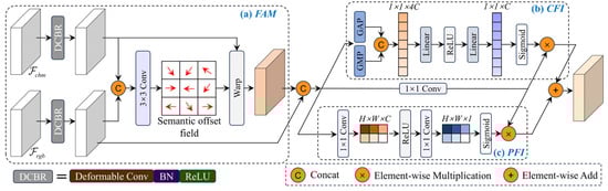 To mitigate the impact of spatial misalignment between multi-branch and multi-level feature maps during feature interaction, we designed a Feature Alignment Module (FAM), as shown in Figure 4a. This module employs deformable convolution to achieve cross-branch spatial consistency correction, thereby providing higher-quality and more robust fused features for subsequent channel-wise and spatial feature interactions. Specifically, the feature maps from the dual branches are independently fed into deformable convolution blocks—each consisting of a fixed 3 × 3 deformable convolution kernel, batch normalization, and ReLU activation—for adaptive spatial alignment. The aligned feature maps are then concatenated and passed through a 3 × 3 convolution layer to predict a semantic offset field, which dynamically refines the spatial correspondence between modalities. This mechanism forms a robust foundation for downstream cross-modal feature fusion and interaction.