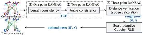 To address the computational inefficiency and mismatch risks associated with conventional RANSAC algorithms in point cloud registration—especially under the presence of outliers arising from acquisition discrepancies between MPC and ALS data—this study introduces TCF approach to optimize coarse registration [38], thereby providing a high-quality initialization for subsequent fine alignment. Traditional RANSAC relies on purely random sampling during its hypothesis generation phase, resulting in exponentially increasing iterations and limited robustness under non-rigid deformation, as its distance-based inlier verification lacks geometric adaptability. In contrast, the proposed TCF method enhances both efficiency and accuracy through a dimension-reduction strategy, as formulated in Equation (1). In the first stage, a length-constrained single-point sampling scheme is employed to eliminate large-scale outliers. In the second stage, a two-point sampling strategy evaluates angular consistency to retain only high-confidence correspondences. Finally, the transformation parameters—including the rotation matrix R and translation vector T—are robustly estimated using a scale-adaptive Cauchy Iterative Reweighted Least Squares (IRLS) solver. The workflow of the TCF algorithm is shown in Figure 5.