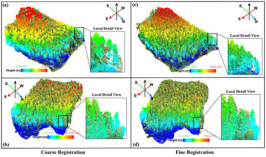 Results of coarse and fine registration of point clouds. (a,b) represent the coarsely registered point clouds of the Forest 1 and Forest 2 regions, respectively, while (c,d) depict the finely registered point clouds for the same regions.