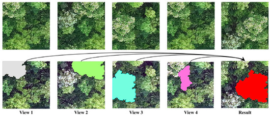 In Section 3.1, the proposed MSFFNet model is used for instance segmentation of tree crowns from multi-view UAV imagery. However, in multi-view images, multiple instance masks from different viewpoints may correspond to the same physical tree crown. To accurately segment individual trees in the 3D point cloud, it is essential to identify 2D masks that belong to the same tree and associate them with their corresponding regions in 3D space. This task is challenging due to segmentation errors in the 2D domain—such as tree crowns being correctly segmented in some views but over-segmented or falsely detected in others. Examples of such inconsistencies are illustrated in Figure 7.