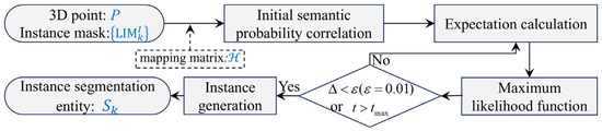 To address this challenge, this study combines multi-view geometry with an expectation–maximization (EM) algorithm based on a semantic probability model to construct a semantic probability field for multi-view instance masks and LiDAR point clouds, thereby resolving inconsistencies in instance masks for the same tree across different viewpoints. The algorithm iteratively optimizes the association probabilities between masks and 3D point clouds within the EM framework, explicitly modeling the uncertainty in segmentation results. Let denote the kth local instance mask in image . We iterate over all masks in all images and create an independent instance container for each mask, where denotes the container for the kth mask instance in image. The algorithm primarily consists of five steps (the workflow is shown in Figure 8): initial semantic probability association, expectation step, maximization step, iteration control, and instance generation.