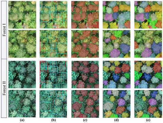 Individual tree instance segmentation results generated by the proposed MSFFNet model. (a–e) represent the original RGB image, object detection results, semantic segmentation results, instance segmentation results, and instance segmentation labels, respectively.