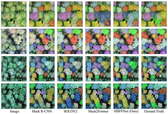 To further evaluate the performance of the proposed instance segmentation model, we conducted comparative experiments with three state-of-the-art instance segmentation methods: Mask R-CNN, SOLOV2, and Mask2Former. As shown in Table 3, the proposed MSFFNet achieved the highest instance segmentation accuracy, with an IoU of 87.60%. In contrast, Mask R-CNN yielded the lowest segmentation accuracy for tree crowns. This can be attributed to its RoI Align operation, which, while preserving spatial information, still relies heavily on local features for pixel assignment within overlapping regions, making it difficult to accurately distinguish adjacent crown boundaries. MSFFNet addresses this limitation through the MLFF module, which enables deep interaction between the CHM and visible imagery. By effectively extracting complementary features and performing iterative cross-modality feature refinement across layers, MSFFNet significantly enhances tree crown detection and boundary delineation capabilities. Notably, MSFFNet outperformed Mask R-CNN, SOLOV2, and Mask2Former in terms of recall, F1-score, and IoU, with the maximum IoU improvements reaching 3.32%, 2.59%, and 1.60%, respectively.
