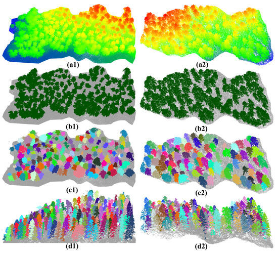 Individual tree segmentation of Forest 1 and Forest 2. (a1–d1) and (a2–d2) represent the elevation-rendered point cloud results, binary classified point cloud results, top-down views of individual tree point cloud segmentation results, and side views of individual tree point cloud segmentation results for Forest 1 and Forest 2, respectively.