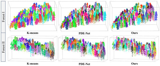 To quantitatively evaluate the performance of individual tree point cloud semantic segmentation, all tree point clouds were manually and meticulously segmented using CloudCompare, serving as the ground truth reference. In addition, to assess the effectiveness of the proposed method, we compared it with two widely adopted baseline approaches: K-means [41] and PDE-Net [42]. As shown in Table 5, the proposed method outperformed all comparison methods across three evaluation metrics: SAC, OME, and COE. It is noteworthy that the SAC value for Forest 1 was higher than that for Forest 2, which can be attributed to the relatively simpler spatial distribution of trees in Forest 1. Overall, the proposed method demonstrated superior performance in individual tree semantic segmentation tasks, confirming its strong robustness in handling complex mountainous forest environments.