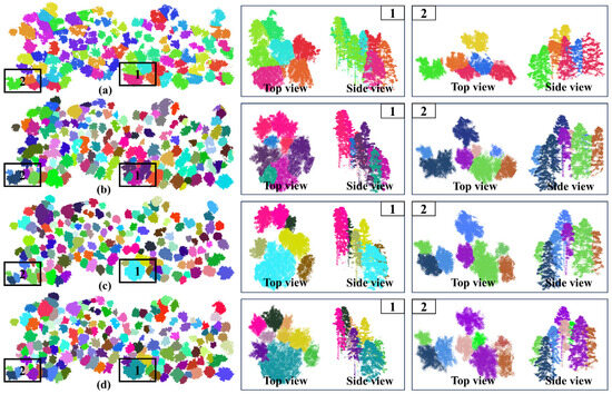 The individual tree point cloud semantic segmentation results obtained by different methods are illustrated in Figure 13 and Figure 14. Multi-view qualitative evaluations demonstrate that the proposed method is capable of effectively segmenting most trees across various forest scenarios. In contrast, the K-means algorithm exhibited the weakest performance due to its sensitivity to noise and outliers, as well as its reliance on a predefined number of clusters. PDE-Net showed comparable performance to the proposed method in segmenting tree crown boundary points; however, in regions with high point cloud overlap, the proposed method outperformed PDE-Net, owing to its superior ability to model topological connectivity within the point cloud. Furthermore, as shown in the enlarged views of Figure 13a,b, for small-sized tree crowns, both K-means and PDE-Net often produce incorrect segmentation results, whereas the proposed method achieved precise segmentation. Overall, the proposed approach demonstrated consistently strong performance across all aspects of individual tree point cloud semantic segmentation.