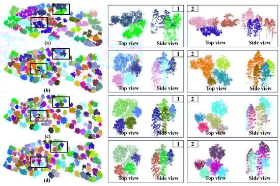 Canopy instance segmentation and point cloud registration serve as critical prerequisites for the proposed cross-modal semantic label transfer method, whose ultimate goal is the individual tree segmentation of 3D point clouds based on cross-modal semantic information. To evaluate the effectiveness of the proposed cross-modal semantic transfer framework in complex forest environments, experiments were conducted on two regions, Forest 1 and Forest 2 (as shown in Figure 11). The point clouds of both forest scenes are color-coded based on elevation values (Figure 11(a1,a2)). After separating ground points, non-ground points are colored according to their semantic labels (Figure 11(b1,b2)), where tree points are marked in green and non-tree points in gray. The results of individual tree point cloud segmentation are presented in Figure 12. The proposed method achieved accurate segmentation for trees with varying morphologies and complex spatial distributions, indicating its effectiveness for individual tree segmentation tasks in forest environments. It is worth noting that the segmentation accuracy in Forest 2 is relatively lower than in Forest 1 (see Table 5), primarily due to the higher degree of crown overlap in Forest 2, which increases the difficulty of accurate boundary delineation.