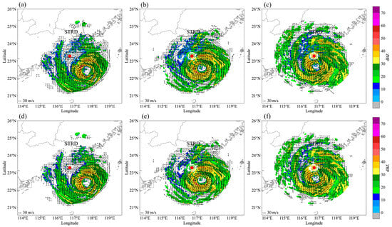 Radar reflectivity (shaded, dBZ) overlaid with wind vectors retrieved by T-TREC (a–c) and T-TREC-IS (d–f) at 3 km altitude at (a,d) 1800 UTC on 8 July 2015, (b,e) 2100 UTC on 8 July 2015, and (c,f) 0000 UTC on 9 July 2015 (red dot indicates the location of STRD).