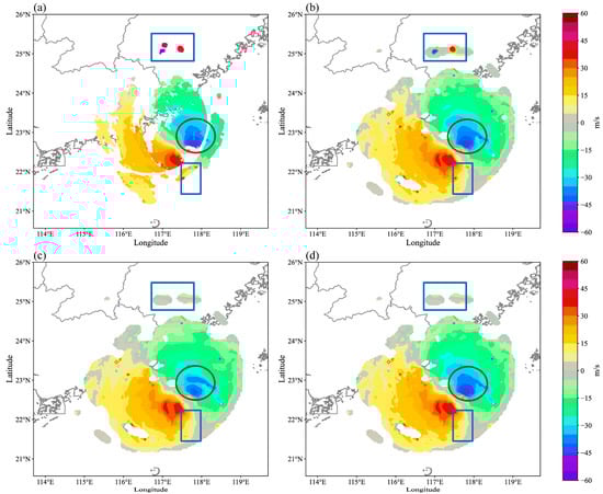 If the direct replacement of radial velocity in T-TREC is not employed, the overall intensity of the retrieved wind field is significantly underestimated (Figure 2c), which further undermines the accuracy of the analysis. However, as shown in Figure 2d, after implementing the iterative smoothing constraint method proposed in this study, erroneous points in the de-aliased radial velocity during radar data quality control were eliminated. This adjustment strengthened the wind field intensity near the typhoon’s inner core compared to Figure 2c, facilitating a more accurate reconstruction of the typhoon’s circulation. Overall, this approach improves the coherence and continuity of the wind field, thus enhancing the feasibility and stability of operational applications.