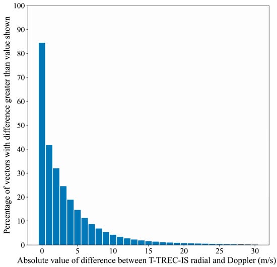 To quantitatively evaluate the retrieval error, this section presents a cumulative bar chart of the absolute error percentage between the radial velocity component of the T-TREC-IS-retrieved wind and the radar-observed radial velocity, recorded hourly from 1800 UTC on 8 July to 0000 UTC on 9 July 2015 (Figure 3). The horizontal axis represents the absolute difference between the radial velocity component of the T-TREC-IS-retrieved wind and the radar-observed radial velocity, while the vertical axis shows the percentage of retrieved wind vectors whose absolute error exceeds the corresponding value on the horizontal axis. The analysis result indicates that the retrieved radial velocity was generally close to the radar-observed value in most cases. However, a small number of wind vectors exhibited large errors (exceeding 15 m s−1), potentially indicating that the retrieval method failed to accurately capture the actual wind field under certain conditions. Overall, approximately 82% of the errors were within 4 m s−1, with a total root mean square deviation (RMSD) of 3.92 m s−1 between the radial velocity component of all retrieved wind and the observed radial velocity. This suggests that the T-TREC-IS algorithm reasonably reconstructs the typhoon circulation. Considering the radar-observed radial velocity error, the retrieval error is set to 4.92 m s−1.