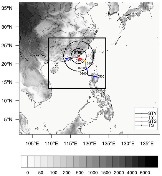 The experimental simulation domain (shaded areas represent terrain height, unit: m) and CMA’s best track of Typhoon Linfa from 0000 UTC on 5 July to 1800 UTC on 9 July 2015 is shown. Track markers are color-coded by intensity class: tropical storm (TS), severe tropical storm (STS), typhoon (TY), and super-typhoon (STY). The radar’s corresponding influence radius is shown (the location of STRD is marked with an asterisk; the inner dashed circle (230 km) delineates the radial velocity range, and the outer dashed circle (460 km) defines the reflectivity range [].