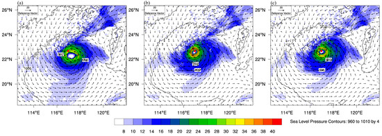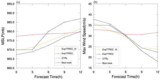 MSLP and MSW are crucial parameters for characterizing typhoon intensity. Figure 10 compares the MSLP and MSW from the CTRL, ExpTTREC, and ExpTTREC_IS experiments with the best observations from the CMA. At 0000 UTC on 9 July, the CMA recorded an MSLP of 970 hPa and an MSW of 35 m s−1. Following landfall, the MSLP gradually increased while the MSW decreased. During the early forecast period, the CTRL experiment significantly underestimated the intensity of the typhoon, resulting in a higher MSLP and a lower MSW. This underestimation is attributed to its weak initial vortex structure. However, in the mid-to-late forecast period, the CTRL predicted a stronger intensity than the best observation, showing a lower MSLP and a higher MSW. This discrepancy arises because the CTRL forecasted a more southern track, keeping the typhoon over the ocean, where reduced surface friction allows for a stronger storm compared to over land. In contrast, the ExpTTREC experiment aligns more closely with the observed intensity trend, effectively capturing the weakening of the typhoon after landfall. Throughout the forecast period, ExpTTREC predicted a lower MSLP and a higher MSW, indicating a stronger typhoon than observed. The ExpTTREC_IS experiment not only reproduced the observed intensity trend but also demonstrated the closest agreement with the observed MSLP and MSW during the early forecast period, accurately reflecting the typhoon’s structure and intensity. Notably, the accuracy of the MSLP forecast remains consistent throughout the forecast period, maintaining small deviations from the observations. Although the MSW was slightly overestimated in the final forecast period, the overall results underscore the positive impact of the iterative smoothing constraint on maintaining assimilation and enhancing forecast effectiveness. This highlights the importance of advanced assimilation techniques in improving the accuracy of typhoon intensity predictions.