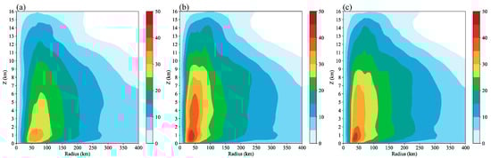 To further investigate the vertical structure of the typhoon, Figure 8 presents the azimuthally averaged tangential wind speed at 0000 UTC on 9 July 2015 for three experiments: CTRL, ExpTTREC, and ExpTTREC_IS. In the CTRL experiment, the region of high wind speeds near the typhoon eyewall was relatively small, and the horizontal gradient of the tangential wind speed was weak. The maximum azimuthally averaged tangential wind speed was measured at only 35 m s−1, situated approximately 65 km from the typhoon center. Additionally, the vertical structure of the typhoon core appears quite shallow. In contrast, the ExpTTREC experiment showed a significant increase in azimuthally averaged tangential wind speed. The high wind speed region near the eyewall was more pronounced, and the tangential wind near the eye exhibited a stronger horizontal gradient. The maximum wind speed in this experiment reached 45 m s−1, located around 30 km from the typhoon center. Furthermore, the area where wind speeds exceeded 30 m s−1 extended vertically up to 8 km, indicating a deep and well-developed typhoon structure. The ExpTTREC_IS experiment exhibited a high wind speed structure similar to that of ExpTTREC. However, it is noteworthy that in ExpTTREC_IS, the strong wind region was more concentrated at lower altitudes, suggesting a different vertical distribution of wind speeds compared to the original experiment. This analysis highlights the impact of the different methodologies on the characterization of the typhoon’s wind field and vertical structure.