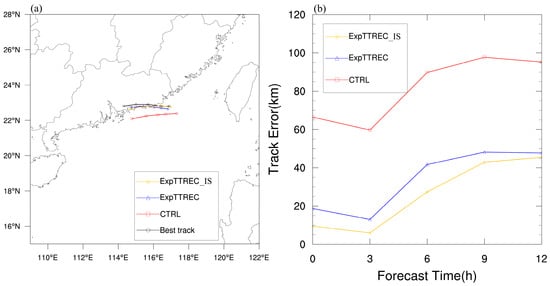 (a) Forecast tracks produced by the CTRL, ExpTTREC, and ExpTTREC_IS experiments, plotted against the CMA’s best track; (b) the temporal evolution of track errors for all three experiments in relation to the CMA’s best track.