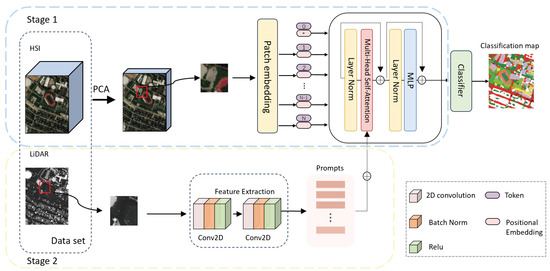To this end, we propose a two-stage network framework for joint HSI-LiDAR classification. In the first stage, a transformer-based model is pre-trained collaboratively on multiple HSI-only datasets to learn shared and transferable spatial–spectral representations. In the second stage, LiDAR data is incorporated as a prompt to adapt the learned transformer network for HSI-LiDAR classification. This strategy facilitates knowledge transfer from auxiliary HSI data and enhances the model’s representation capacity. Thorough evaluations on standard benchmark datasets confirm that our approach outperforms existing methods.