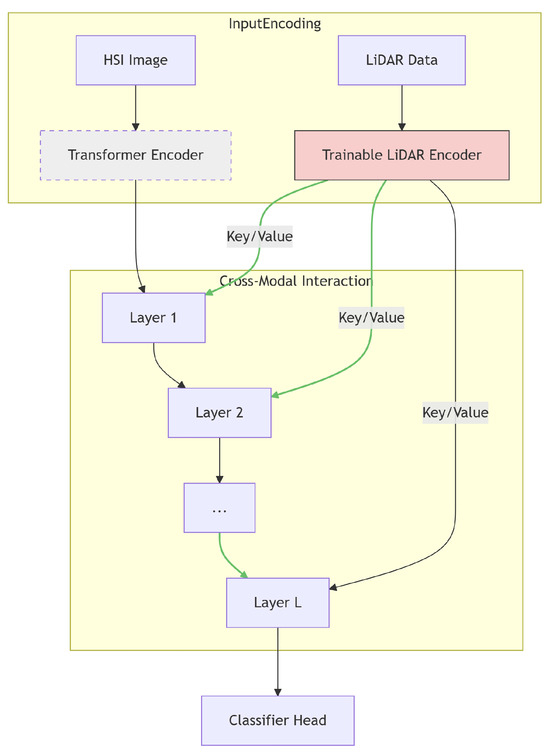Prompt-based methods adapt pre-trained models by inserting learnable guidance signals, avoiding the need for full model fine-tuning. In the context of HSI–LiDAR fusion, two dominant paradigms can be distinguished. Input-level prompt tuning injects LiDAR-derived tokens at the model’s input stage, while cross-modal attention prompt tuning dynamically modulates intermediate representations through attention mechanisms. In the input-level approach, LiDAR data (e.g., elevation maps) are processed via a lightweight MLP to generate prompt tokens, which are concatenated with HSI patch embeddings at the frozen ViT’s input layer. By contrast, the cross-modal approach adopted in this work encodes LiDAR information into high-level features and introduces them as dynamic prompts through cross-attention layers. Here, LiDAR features serve as key/value pairs to iteratively refine HSI queries, enabling richer semantic interaction and deeper feature fusion. Empirical results shown in Table 9 confirm that the cross-attention-based prompt tuning outperforms the input-level strategy, as it allows more effective interaction between HSI and LiDAR features, leading to enhanced fusion and stronger performance.