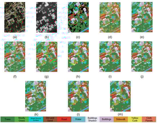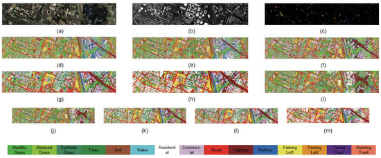 Comparative visualization of classification maps across models: Houston 2013 dataset. (a) Pseudo-color composite image based on bands 64, 43, and 20 for HSIs. (b) Grayscale image for LiDAR-based DSM. (c) Ground-truth map. (d) SVM. (e) RF. (f) MLR. (g) KNN. (h) S2ENet. (i) FusAtNet. (j) Vit. (k) SpectralFormer. (l) MTNet. (m) Proposed method.