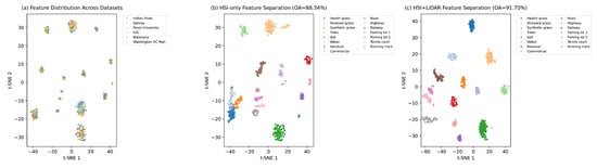 To further analyze the representativeness of the training data, we employed t-SNE visualization, as shown in Figure 6, which reveals the following key observations: First, the visualization confirms that our training data spans a broad range of scenarios, demonstrating strong representativeness across diverse environments. However, when relying solely on hyperspectral imagery (HSI), certain challenging classes, such as Healthy Grass, exhibit substantial feature overlap, leading to reduced class separability and a lower overall accuracy (OA) of 88.34%. By integrating LiDAR data, this limitation is substantially mitigated; the fused representation enhances feature discriminability, particularly for critical and visually similar classes, ultimately improving OA to 91.70%. These findings highlight not only the diversity of the dataset but also the clear advantage of incorporating LiDAR data to strengthen class separation and overall model performance.