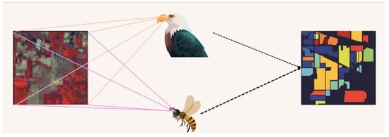 Inspired by the biological mechanism characterized by rapid perception, selective attention, and discriminative decision-making, a bionic and lightweight hyperspectral image classification network, termed BioLiteNet, is proposed in this study. BioLiteNet is designed to substantially reduce model parameters and computational complexity while maintaining high classification accuracy, thereby enabling the efficient and deployable recognition and classification of hyperspectral images. As shown in Figure 1, the proposed model adopts a simplified architecture inspired by bees, yet achieves classification performance comparable to that of complex, large-scale models symbolized by birds, reflecting the bionic design philosophy of “achieving more with less”. The main contributions of this paper are as follows.