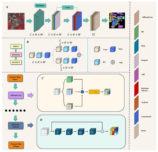 The BioLiteNet model proposed in this paper is composed of several functional modules, with the two core components being BeeSenseSelector and AffScaleConv. The BeeSenseSelector module integrates global spectral statistics and local spatial responses. Through the dynamic Top-K channel screening strategy, it simulates the focusing mechanism of honeybees on key targets during the sensing process and adaptively selects the spectral–spatial channels with the highest discriminative power for classification, thereby suppressing redundant noise and enhancing the sparsity and effectiveness of the feature representation. The AffScaleConv module is inspired by the perceptual characteristics of the honeybee’s multi-scale perspective. It incorporates multiple parallel depth-separable convolutional branches to capture spatial textures and spectral features at various scales, and fuses their outputs through  convolution, considering both feature richness and computational efficiency.