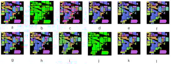 Visualization of HSI classification results on the Indian Pines dataset. (a) Ground Truth; (b) HybridSN; (c) ViT; (d) LeViT; (e) DiT; (f) HiT; (g) Yang; (h) RvT; (i) T2T; (j) DGPF; (k) SS-Mamba; (l) Ours. (b,j) additionally show the distribution of misclassified pixels, where green denotes correctly classified pixels and red indicates misclassified ones.