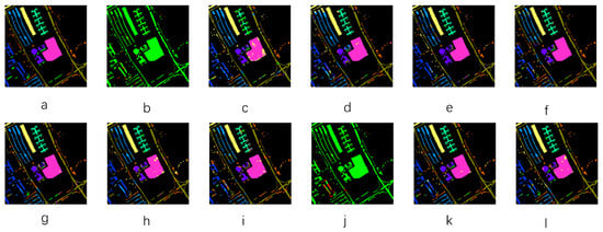 Visualization of HSI classification results on the Pavia University dataset. (a) Ground Truth; (b) HybridSN; (c) ViT; (d) LeViT; (e) DiT; (f) HiT; (g) Yang; (h) RvT; (i) T2T; (j) DGPF; (k) SS-Mamba; (l) Ours. (b,j) additionally show the distribution of misclassified pixels, where green denotes correctly classified pixels and red indicates misclassified ones.