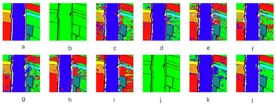Visualization of HSI classification results on the WHU-Hi-LongKou dataset. (a) Ground Truth; (b) HybridSN; (c) ViT; (d) LeViT; (e) DiT; (f) HiT; (g) Yang; (h) RvT; (i) T2T; (j) DGPF; (k) SS-Mamba; (l) Ours. (b,j) additionally show the distribution of misclassified pixels, where green denotes correctly classified pixels and red indicates misclassified ones.