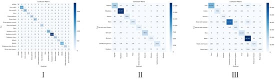 Confusion matrix heatmaps of BioLiteNet on three hyperspectral datasets. (I) Indian Pines, (II) Pavia University, (III) WHU-Hi-LongKou.