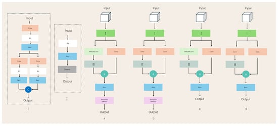 Shows the ablation study results: (a) Our full model. (b) Without AffScaleConv. (c) Without BeeSenseSelector. (d) Without both AffScaleConv and BeeSenseSelector, where (I) indicates that the input features undergo Conv, BatchNorm, and ReLU operations, followed by feature concatenation, and (II) indicates the feature maps processed by BatchNorm, ReLU, and Dropout operations.