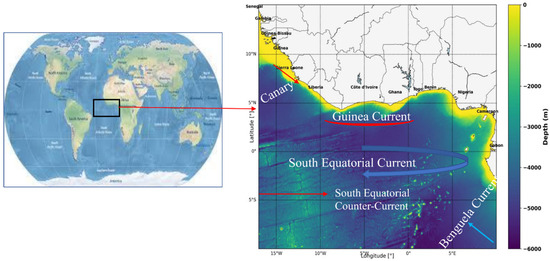 Bathymetric map of the Gulf of Guinea based on the GEBCO 15-arc-second global dataset (https://www.gebco.net/ accessed on 20 June 2024), showing seafloor depths > 10 m. Major surface currents influencing regional ocean dynamics are overlaid. National boundaries and labels provide geographic context.
