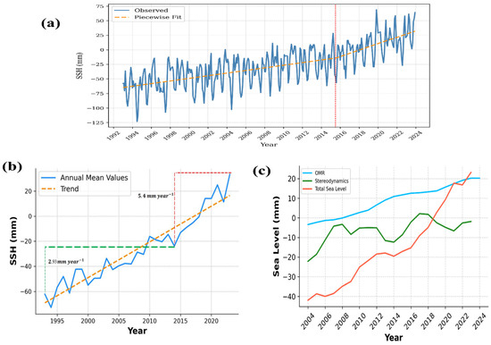 Satellite altimetry analysis reveals a marked acceleration in SLR across the Gulf of Guinea. Piecewise linear regression applied to monthly sea-level anomalies identifies a statistically significant breakpoint in 2015 (Figure 2a). Before this breakpoint (1993–2014), the regional trend averaged 2.93 ± 0.10 mm/year, below the global mean of 3.3 ± 0.3 mm/year [23]. Following 2015, the rate increased sharply to 5.4 ± 0.25 mm/year, exceeding the concurrent global trend of 4.3 mm/year (AVISO, https://www.aviso.altimetry.fr/en/data/products/ocean-indicators-products/mean-sea-level.html accessed on 16 February 2024). The full-period linear trend from 1993 to 2023 yields a mean rate of 3.82 ± 0.34 mm/year, consistent with the range of 3.47 to 3.89 ± 0.10 mm/year reported for 1993–2021 by [7] in the region, and confirming the presence of a recent acceleration phase (Figure 2b). This trend aligns with broader global patterns but shows enhanced regional variability. Component decomposition (Figure 2c) illustrates a shift in the dominant contributors to SLR. From 1993 to 2023, sterodynamic processes, primarily thermosteric, contributed an average of 1.24 ± 0.10 mm/year. During the early period of GRACE measurements (pre-2007), the steric trend was higher, measured at 1.71 ± 0.20 mm/year, accounting for approximately 65% of the total sea-level rise. This trend subsequently slowed, approaching zero, and remained nearly stagnant for eight years before peaking in 2015. Between 2002 and 2023, thermosteric contributions increased slightly to 1.36 ± 0.28 mm/year, while halosteric effects added 0.21 ± 0.13 mm/year. In contrast, the OMR component exhibited a significant increase. GRACE/GRACE-FO mascon solutions estimate an OMR contribution of 1.92 ± 0.42 mm/year between 2002 and 2023, exceeding the regional steric contribution over the same interval. This estimate closely aligns with but remains slightly below the 2.6 mm/year value reported by [24] for the same region and period (2002–2023). The residual term, accounting for vertical land motion (VLM) and other unmodeled signals, explained approximately 0.53 mm/year.
