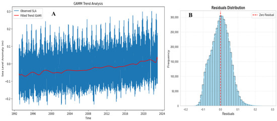 The observed SLA (blue line) with the fitted trend using B-spline smoothing (red line) from the generalized additive mixed model (GAMM) (A); the residual distribution from the model, represented as a histogram (sky blue) with an overlaid kernel density estimate (KDE) curve, highlighting the residual pattern (B).