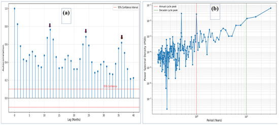 The autocorrelation function (ACF) of mean SLA values over 40 monthly lags highlights significant peaks at 12, 24, and 36 months (red–blue arrows). The black dashed line represents zero autocorrelation, while the red dashed lines denote the 95% confidence interval. The gradual decay of autocorrelation values indicates the persistence of temporal correlations (a). The power spectral density (PSD) of SLA shows variance distribution across log-scaled periods (x-axis, in years) and PSD values (y-axis). Log-period scaling, following oceanographic convention, enhances resolution of seasonal to decadal variability and highlights dominant climate modes (b).
