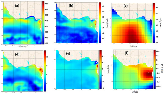 Spatial trends in sea level and its components, based on OLS regression analysis, reveal notable differences between the pre- and post-2015 periods (Figure 5). During 1993–2014, sea-level rise exhibited a coherent spatial pattern, with moderate increases of approximately 2.7 mm/year across the equatorial Atlantic (Figure 5a–c). Enhanced trends were observed toward the western Gulf of Guinea, particularly near the Bight of Benin and along the Cameroonian coast, where values reached up to 3.8 mm/year. OMR contributions remained relatively low along the immediate coastline (~1.0 mm/year) but increased offshore (~2.5 mm/year), suggesting barystatic dominance during this period. The sterodynamic component exhibited a meridional gradient, with values rising from approximately 1.0 mm/year in the southern basin to 3.0 mm/year along the northern shelf.