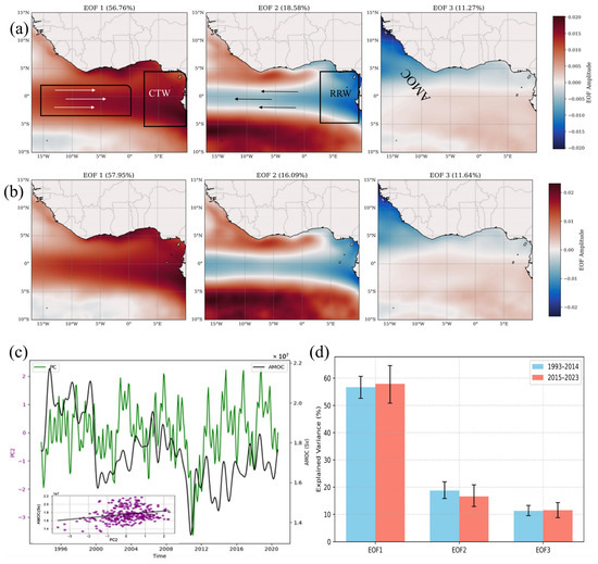 The EOF analysis of SLA reveals consistent spatial patterns in the leading three modes for 1993–2014 and 2015–2023, with notable shifts in explained variance (Figure 6a,b). Between 1993 and 2014, EOF1 explained 56.76% of the total variance and captured a dominant eastward-propagating SLA signal from the equatorial Atlantic into the Gulf of Guinea, driven by equatorial Kelvin waves (EKWs) transitioning into coastal trapped waves (CTWs) upon shelf interaction, leading to elevated sea levels at the coast. EOF2 (18.58%) exhibited an equatorial westward-propagating reflected Rossby wave (RRW) structure associated with coastal sea-level depression and enhanced SLA in both hemispheres, influenced by regional current dynamics. EOF3 (11.27%) displayed a dipolar structure centered off the equatorial coast and the southern Gulf of Guinea, consistent with the spatial signature of AMOC variability.