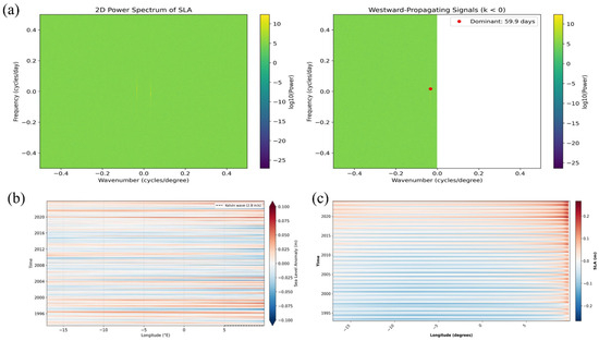 (a) Two-dimensional power spectral density of SLA along the equatorial band (5°S–5°N), derived from fast Fourier transform (FFT) analysis. The left panel shows log-scaled spectral power as a function of frequency (cycles/day) and zonal wavenumber (cycles/degree); the right panel isolates westward-propagating signals (negative wavenumbers, k < 0). The red marker highlights the dominant mode with a 59.9-day period and ~30° wavelength, consistent with first-mode equatorial Rossby wave dynamics. (b) Hovmöller diagram of equatorial SLA showing eastward-propagating features. Horizontal dashed lines indicate the theoretical phase speed (2.8 m/s) of first-mode baroclinic Kelvin waves. (c) Hovmöller diagram emphasizing westward-propagating SLA signals. Diagonal trajectories align with the spectral mode identified in (a), supporting the presence of Rossby wave activity across the equatorial Atlantic.
