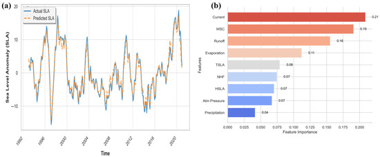 The comparison between the observed SLA (solid blue line) and the predicted SLA (dashed orange line) is derived using a random forest regression (RFR) model with forcing variables as predictors (a). The feature importance of the RFR model, displayed as a horizontal bar chart, illustrates the magnitude of the contribution of each predictor to the model (b). Adapted from Ayinde et al., 2023 [6].