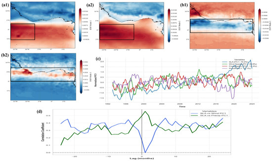 First empirical orthogonal function (EOF1) modes of zonal wind stress and precipitation over the Gulf of Guinea, shown separately for two periods: (a1,a2) zonal wind EOF1 spatial patterns for 1993–2014 and 2015–2023; (b1,b2) precipitation EOF1 spatial patterns for 1993–2014 and 2015–2023. (c) Normalized time series of PC1 for wind and precipitation, alongside total runoff, compared with regional SLA anomalies from 1993 to 2023. (d) Cross-correlation functions between SLA and wind PC1 (blue), and SLA and precipitation PC1 (green), showing leading–lagging relationships. Black boxes highlight regions of highest variability, except in (b1), which denotes regions of lowest variability.