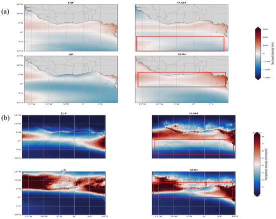 Spatial trends in seasonal variability of (a) sea-level anomaly (SLA) and (b) precipitation across the Gulf of Guinea from 1993 to 2023, derived from monthly mean values at each grid point. The panels reveal strong seasonal heterogeneity between the northern and southern sub-basins. Red boxes indicate zones of pronounced SLA and rainfall divergence, reflecting spatially distinct ocean–atmosphere interactions across the basin.