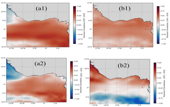 To assess the relative contributions of thermohaline and mass-driven processes to regional SLA, spatial correlations were computed between SLA and its two dominant components, sterodynamic height (combined steric and dynamic) and OMR, across two epochs: 1993–2014 and 2015–2023. During 1993–2014, SLA showed a strong correlation with sterodynamic height (r ≈ 0.7) throughout the equatorial and northern GoG (Figure 12(a1)). This spatial pattern matches the leading mode of SLA variability captured in EOF1 (Figure 6a,b), dominated by eastward-propagating equatorial Kelvin waves (EKW) and associated steric effects. The coherence reflects a basin-scale dynamical regime in which wave adjustment redistributes subsurface heat and modulates density structure. Concurrent SLA–OMR correlations range from r = 0.4–0.6 and are broadly distributed across the basin (Figure 12(b1)). Although weaker than the steric signal, the OMR pattern follows the same zonal structure as the EKW pathway, suggesting complementary hydrological modulation.