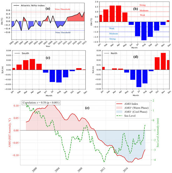 Time series of the Atlantic Niño Index (ONI) from 1993 to 2023, representing the sea surface temperature anomaly in the Atlantic Ocean region (5°S to 5°N, 30°W to 10°W), positive values indicate Niño conditions (red shading), while negative values correspond to Niña conditions (blue shading). The dashed red and blue lines represent threshold values for Niño and Niña events, respectively (a); monthly time series of the ONI. Positive values (shown in red) represent Niño conditions, while negative values (shown in blue) correspond to Niña conditions. The red dashed lines at 0.5, 1.0, and 1.5 denote weak, moderate, and strong Niño thresholds, respectively, while the blue dashed lines at −0.5, −1.0, and −1.5 indicate weak, moderate, and strong Niña conditions (b); monthly time series of the SLA along the northern basin with positive anomalies (shown in red) indicate regions of higher-than-average sea level, while negative anomalies (shown in blue) represent lower-than-average sea level (c); and along the southern basin (d); standardized Atlantic Multidecadal Oscillation (AMO) Index, representing sea surface temperature anomalies in the Atlantic Ocean (0°N–60°N, 80°W–0°W), with a 5-year running mean, and SLA in the Gulf of Guinea (1993–2023) (e).