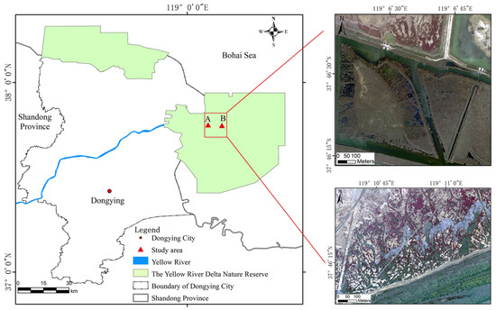 The YRD Nature Reserve, located at the mouth of the Yellow River, is on the shore of the Bohai Sea and is an important habitat for terrestrial wildlife. The nature reserve can be divided into three areas: the Yellow River Ancient Estuary 102 in the north, the current Yellow River estuary Dawenliu, and the Yellow River estuary in the south. The wetland at the mouth of the Yellow River is one of the largest in China. Due to the abundant water source, abundant vegetation, unique hydrological conditions, confluence of sea and fresh water, and abundant organic matter content, a large number of salt marsh plants have grown. As is shown in Figure 1, the most common vegetation types are S.s, P.a, T.c, etc. It also provides a habitable place for birds to live and breed; therefore, it has rich wildlife ecological resources and unique ecosystems. Simultaneously, the area is rich in marine resources, and the salt and fishing industries are thriving, carrying the history and culture of the Chinese nation. To improve the classification accuracy of salt marsh vegetation, this study combined field wetland surveys with considerations of the complexity of salt marsh vegetation growth. Two distinct areas, A and B, were selected within the YRD Nature Reserve for experimentation. Due to significant differences in salt marsh vegetation distribution, Area A is a typical mixed vegetation zone located on tidal flats, with uneven vegetation distribution. The closer to the northern side of the tidal flats, the more S.s and T.c grow. In Area B, vegetation communities are uniformly distributed, with flooded P.a in ponds, extensive S.s patches on tidal flats, Imperata cylindrica (I.c) along roadside edges, and T.c growing along pond margins. The locations of the study area are shown in Figure 2.