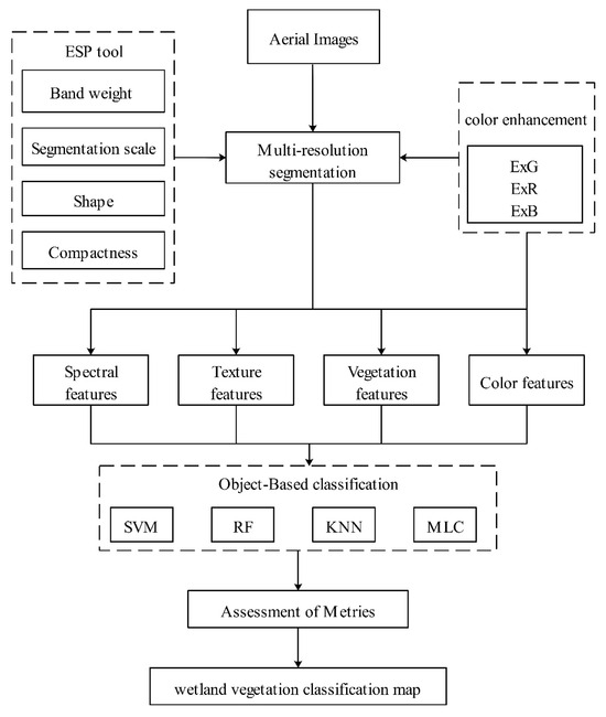 In this study, we used object-oriented classification methods based on color enhancement for fine classification of vegetation. The Technical flowchart is shown in Figure 3. First, we used the local variance of the ESP tool to determine the optimal segmentation scale, and second, the optimal shape factor and compactness factor were determined by experimental comparison. At the same time, color features are used to enhance the differentiation between different vegetation in the image. Based on multi-resolution segmentation, we use random forest (RF) [39], support vector machine (SVM) [40], k-nearest neighbor (KNN) [41] and maximum likelihood classifiers (MLC) [42] to classify the spectral features, texture features and vegetation features of the images. Color features are not only used as an auxiliary layer for object segmentation but also for optimal classification. Then, the confusion matrix calculation is used to evaluate the classification accuracy. Finally, the fine classification map of vegetation using the object-oriented classification based on color enhancement is visualized.