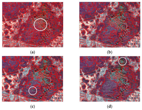 Local segmentation results of different scales: (a) scale 50, (b) scale 100, (c) scale 150, (d) scale 200. The white circles are used to emphasize over-segmentation and under-segmentation areas.