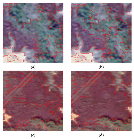 As shown in Figure 5, the object in (a) was too large, mixing P.a and T.c into one object. In (b), S.s was divided into two objects. However, optimized images (b) and (d) can effectively reduce the occurrence of this phenomenon. Because S.s is often a large area with a dense shape, the mixed phenomenon of P.a and T.c in the image is more obvious, and the distribution is relatively fragmented. Usually, the segmentation effect is based on the ability to distinguish the smallest shape of the ground. Therefore, S.s will still have over-segmentation.