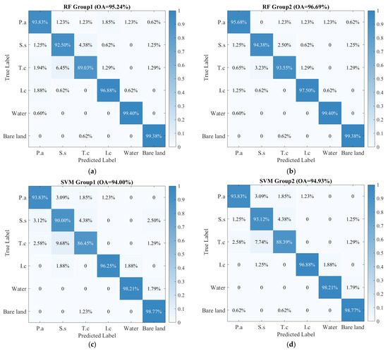 As shown in Table 2, RF and SVM can effectively extract each class of vegetation from 20 cm aerial images, with fewer misclassifications than MLC and KNN. RF achieved performance greater than 95% in both groups and was the optimal method. SVM follows closely behind, but in both groups, the UA for S.s and the PA for T.c are both below 90%, with some misclassifications and errors. MLC and KNN have lower accuracy, particularly in S.s and T.c. KNN had the lowest accuracy in both groups. Bare land, water, and I.c exhibit high PA and UA, maintaining stable accuracy across all methods in each group, indicating that these classes are relatively easy to distinguish. The classification results for I.c were particularly good, with PA and UA both exceeding 95%. Overall, these four classifiers are suitable for vegetation classification, with OA above 90% and Kappa greater than 0.9. RF and SVM have higher OA and Kappa than MLC and KNN, performing better in vegetation classification. Among them, RF has the highest OA and Kappa values, at 96.69% and 0.9603, respectively.