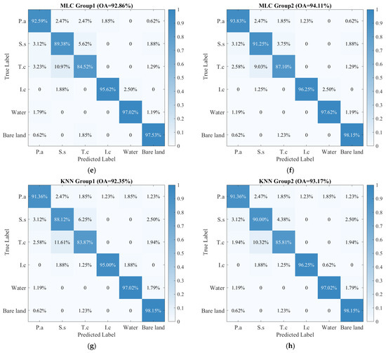 Normalized confusion matrices of classification using RF (a,b), SVM (c,d), MLC (e,f), and KNN (g,h), in which (a,c,e,g) used color information. In contrast, (b,d,f,h) did not use color information.