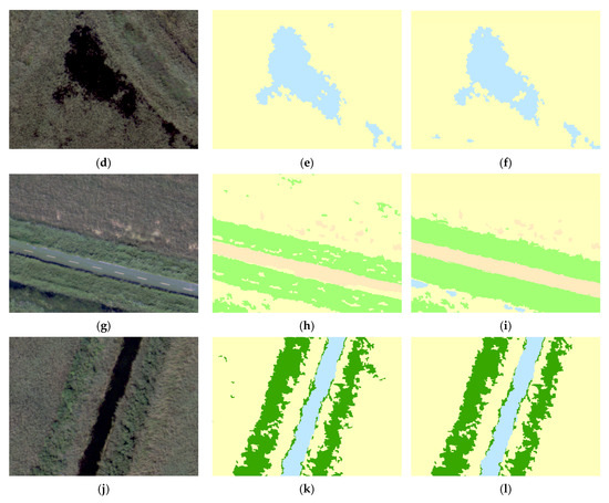 The RGB true color composite imagery (a,d,g,j) in study areas. (b,e,h,k) did not use color information. In contrast, (c,f,i,l) use color information.