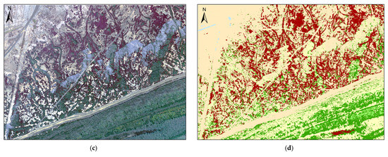 The RGB true color composite imagery in study Area A (a) and study Area B (c) and distribution of vegetation in study Area A (b) and study Area B (d).